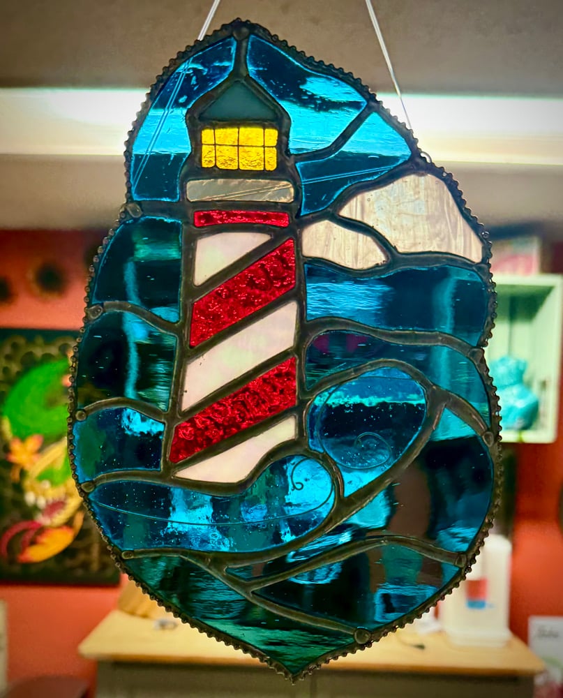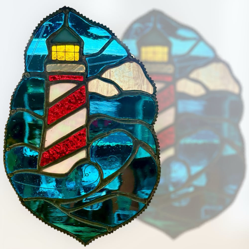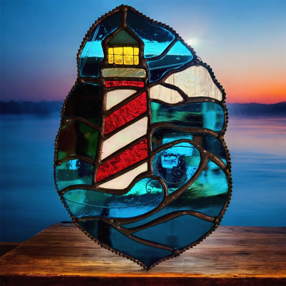 This lighthouse panel shines with timeless coastal charm. The bold red and white stripes stand tall against a sky of shifting blues and soft rolling clouds, while the golden glow of the lantern radiates hope and safety. The stylized waves flow around the base in a way that balances drama with simplicity. Framed in a freeform edge, this piece embodies strength, guidance, and the beauty of the sea.