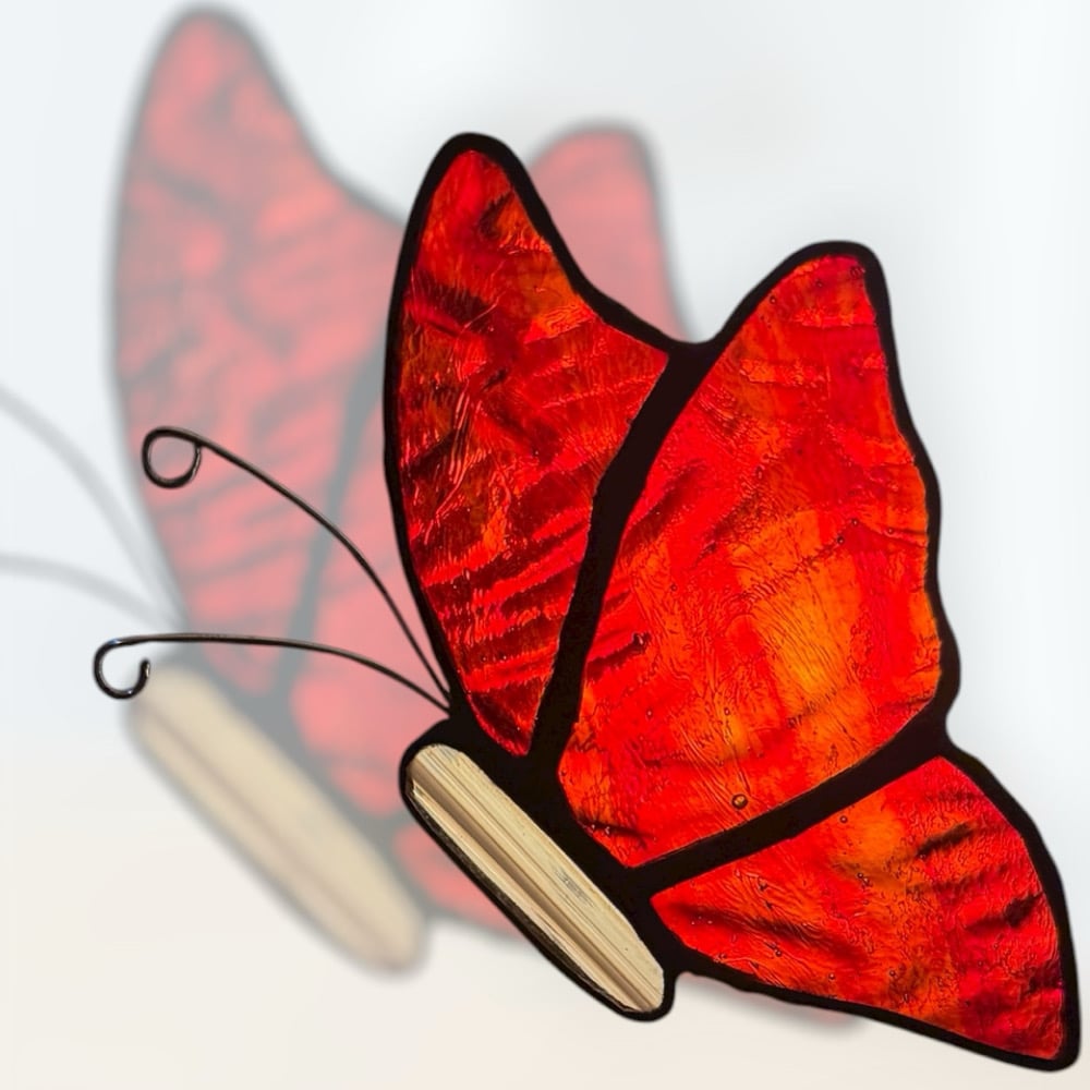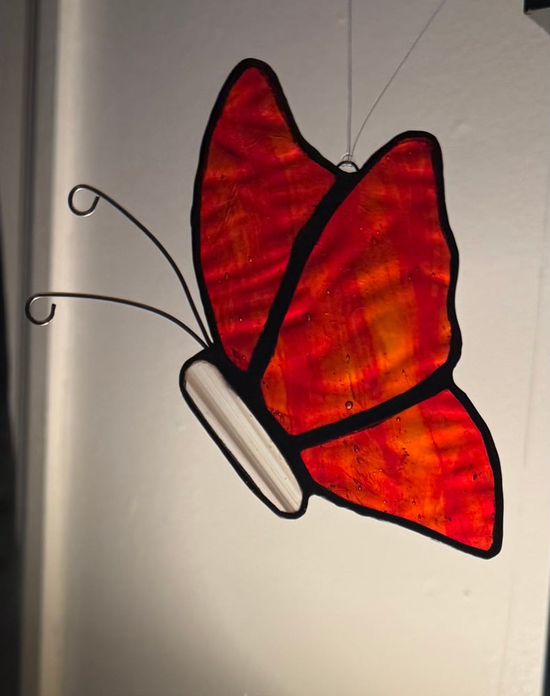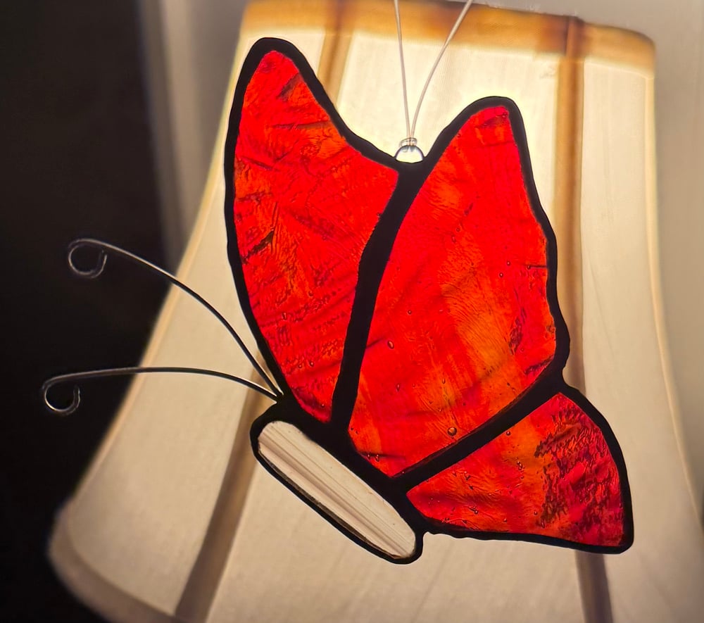 The fiery red-orange glass glow feels alive, like glowing embers lifting into the air.