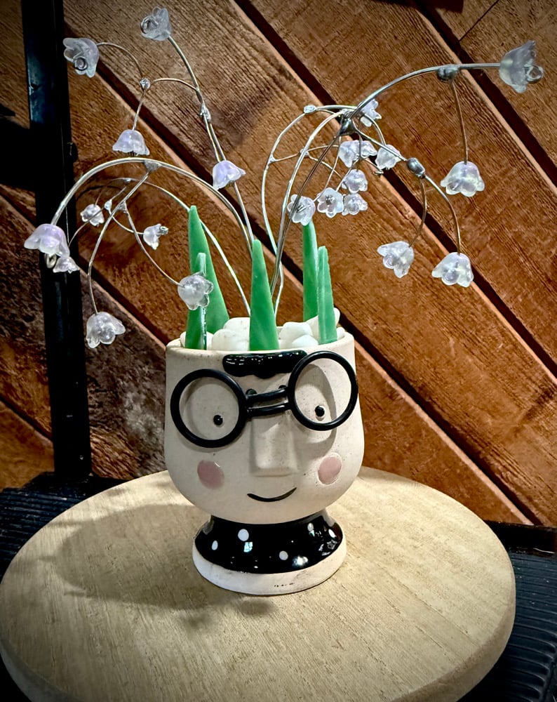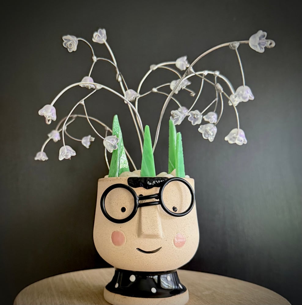 Playful yet refined, Oliver brings smiles with his round glasses and cheerful blush. His lily of the valley stems sparkle with iridescent blossoms and stained glass leaves, making him the perfect whimsical accent piece for your home.