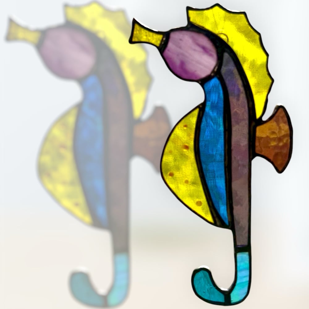 This cheerful little seahorse brings a playful splash of color to any window. With his bright hues of purple, blues and yellows and whimsical shape, Posey is like a friendly companion from the sea — always drifting along with a smile. He’s the perfect reminder of lighthearted days by the water, full of wonder and joy.