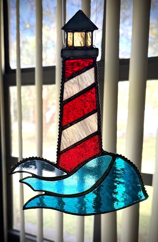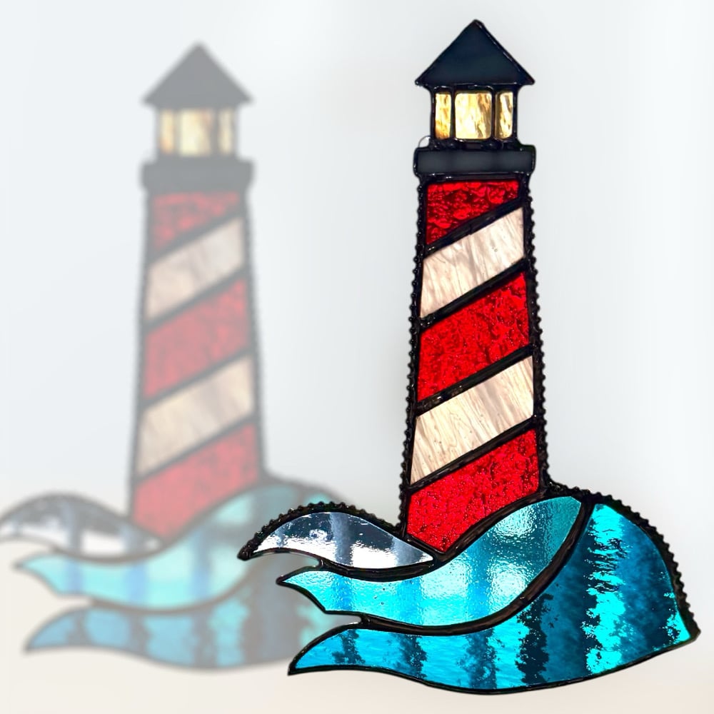 This stained glass lighthouse captures the magic of evening on the water, where the fading glow of the sunset meets the steady shine of the guiding light. With its bold red-and-white tower rising from shimmering blue waves, Twilight Beacon symbolizes safety, guidance, and hope — a reminder that even as day turns to night, light will always lead the way.