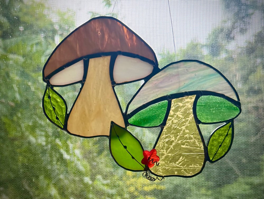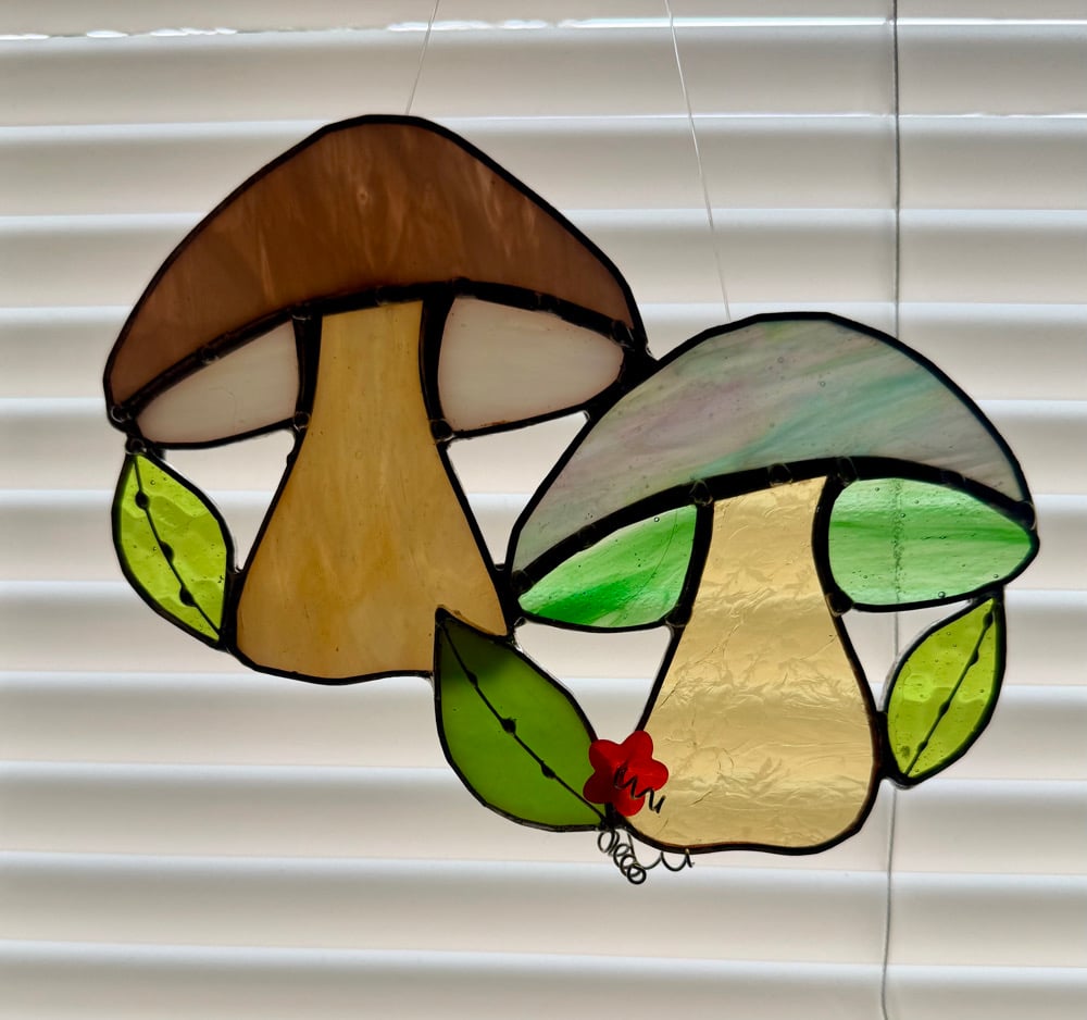 This stained glass piece captures the charm of the forest floor, featuring two whimsical mushrooms accented with leaves and a tiny red flower. The earthy browns and soft greens bring a sense of woodland peace, while the playful shapes make it a delightful accent for any space.